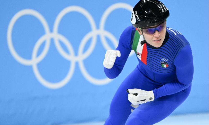 2022年2月16日,北京冬奥会短道速滑女子1500米半决赛赛况,意大利选手阿里安娜·方塔娜在比赛后。新华社发